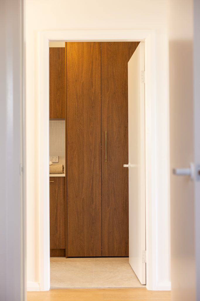 Full height cabinetry provides room for appliances, cleaning products, towels and everyday essentials. Overhead cupboards and base cabinetry ensure everything has a place, while still keeping the benchtop clear.