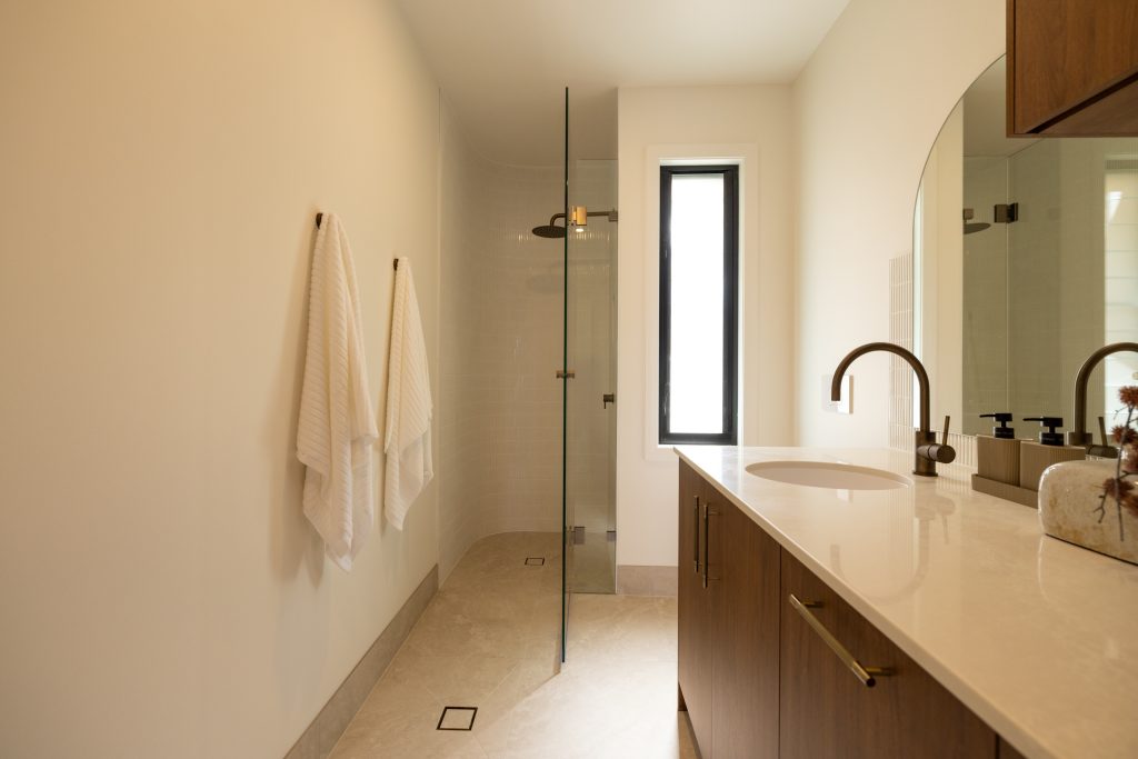 The long, linear layout allows for clear zoning. On one side, you have the custom joinery and basin area. On the other, a walk in shower that feels generous and open. There is space to move, space to use the room comfortably, and space for everything to sit exactly where it should.